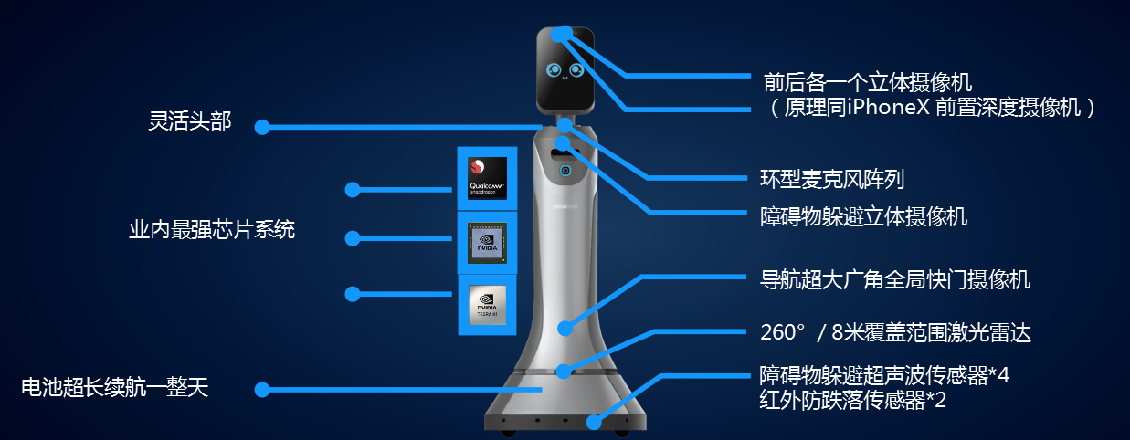 1200万摄像头:1个,主要用于头部前方的拍照、视频 广角彩色摄像头:2个,主要用于头部前后的检测人脸&人体、跟踪 RGBD深度摄像头:3个,主要用于测距、获取深度信息,避障 广角鱼眼摄像头:1个,主要用于视觉重定位 |